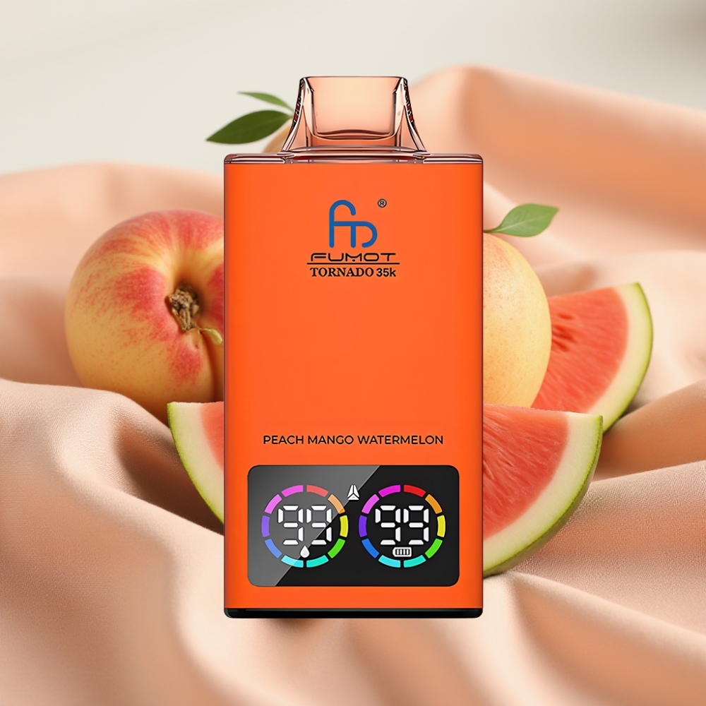 Fumot Tornado 35K Disposable Vape Dual Mesh Coil RGB Licht 15ml E-Liquid 700mAh USB-C 35000 Puffs Pfirsich Mango Wassermelone